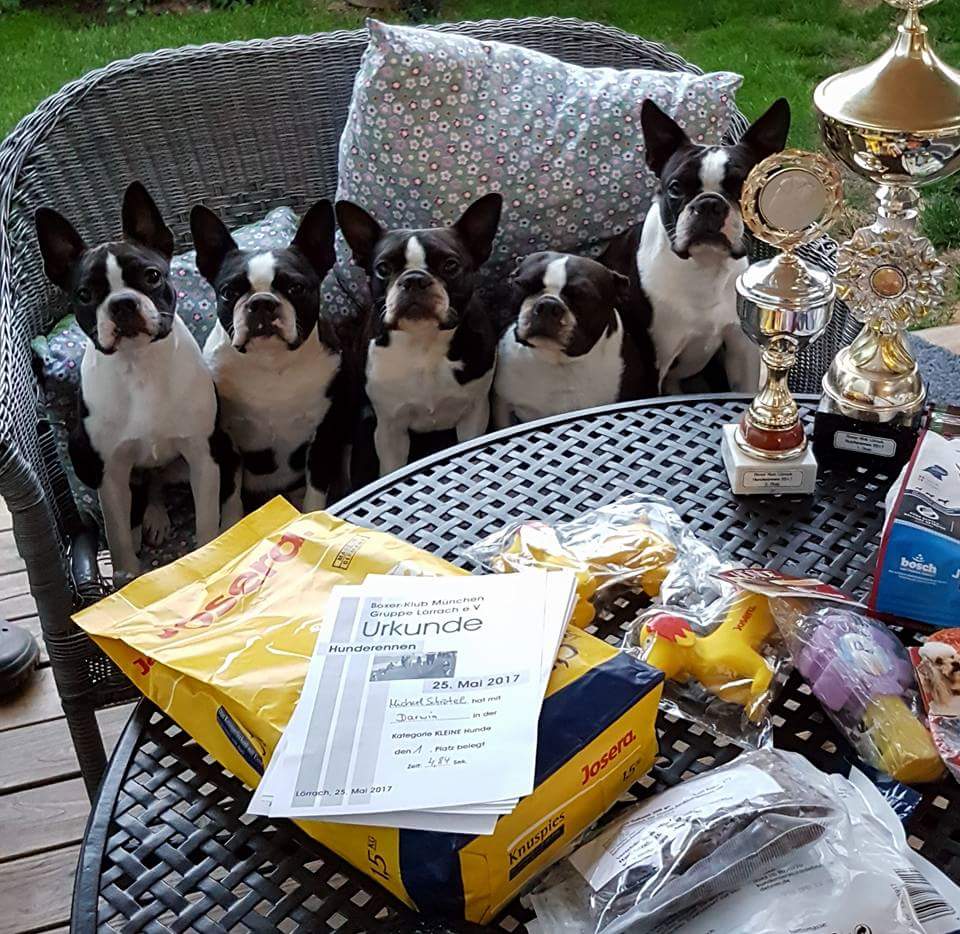 Bevor das Jahr um ist....  ich habe es endlich geschafft die Homepage zu aktualisieren. Es gibt neue Fotos unter Nachwuchs, sowie Neuigkeiten bei JCh.CH Charlotte vom Staufenberg; sie erreichte auf der Cacib in Aarau beide Tage ein V1 und erhielt ihre restlichen Anwartschaften für den Schweizer-Veteranen-Champion, sowie Ch. Emelie (Hessenvilla's Good Luck at Bardonique) hat ihre Urkunde erhalten und ist nun offiziell Internationaler Schönheits-Champion! Weiterhin waren wir auf der Clubschau der Boston-Terrier Freunde Schweiz und Frieda von Bardonique war das erste Mal in der Erwachsenenklasse und erhielt ein V1, Cac. Greta von Bardonique hatte ihr Debut in der Jüngstenklasse und erhielt ein tolles VV4 bei starker Konkurrenz. Ich bin sehr stolz auf meine Mäuse. Ausserdem waren wir wieder erfolgreich auf den umliegenden Hunderennen unterwegs. Die Bardonique's erhielten beim Hunderennen auf dem Boxerplatz in Lörrach folgende Plätze
