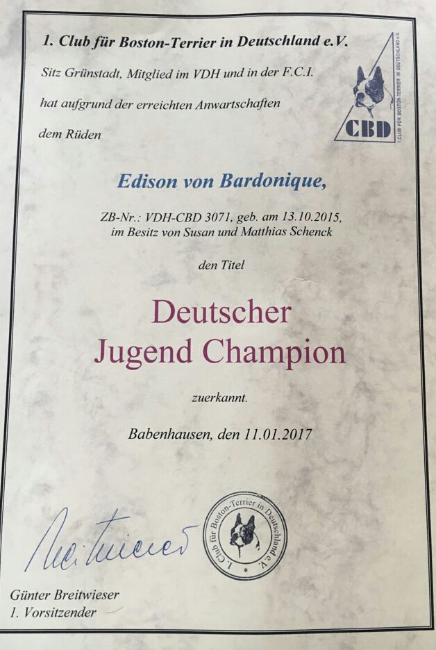 Ich freue mich sehr und bin stolz! Edison von Bardonique ist nun offiziell Deutscher Jugend Champion CBD. Herzlichen Glückwunsch den "Eltern", weiter so, ihr macht das toll!