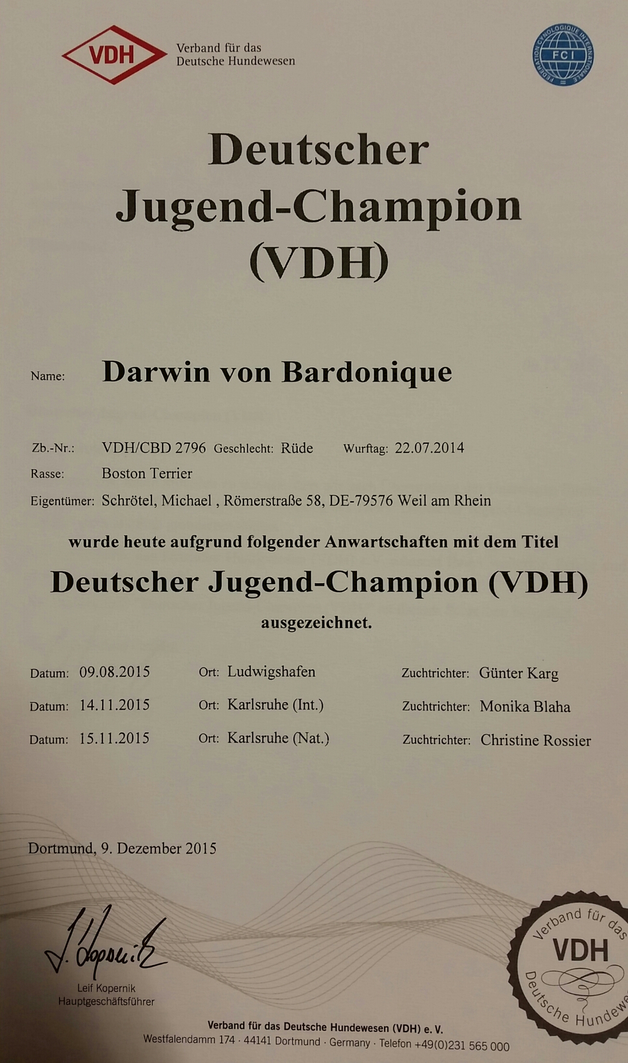 09.12.2015 Hurra seit heute ist es offiziell Darwin ist Jugend Champion VDH, ich freu mich sehr! Zurück...