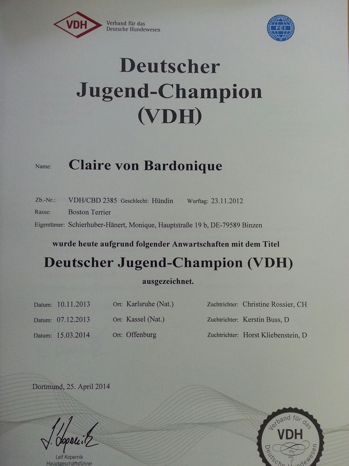 Nun ist es amtlich Claire erhielt heute Ihre Urkunde - nun ist sie offiziell Deutscher Jugend-Champion VDH. Zurück...