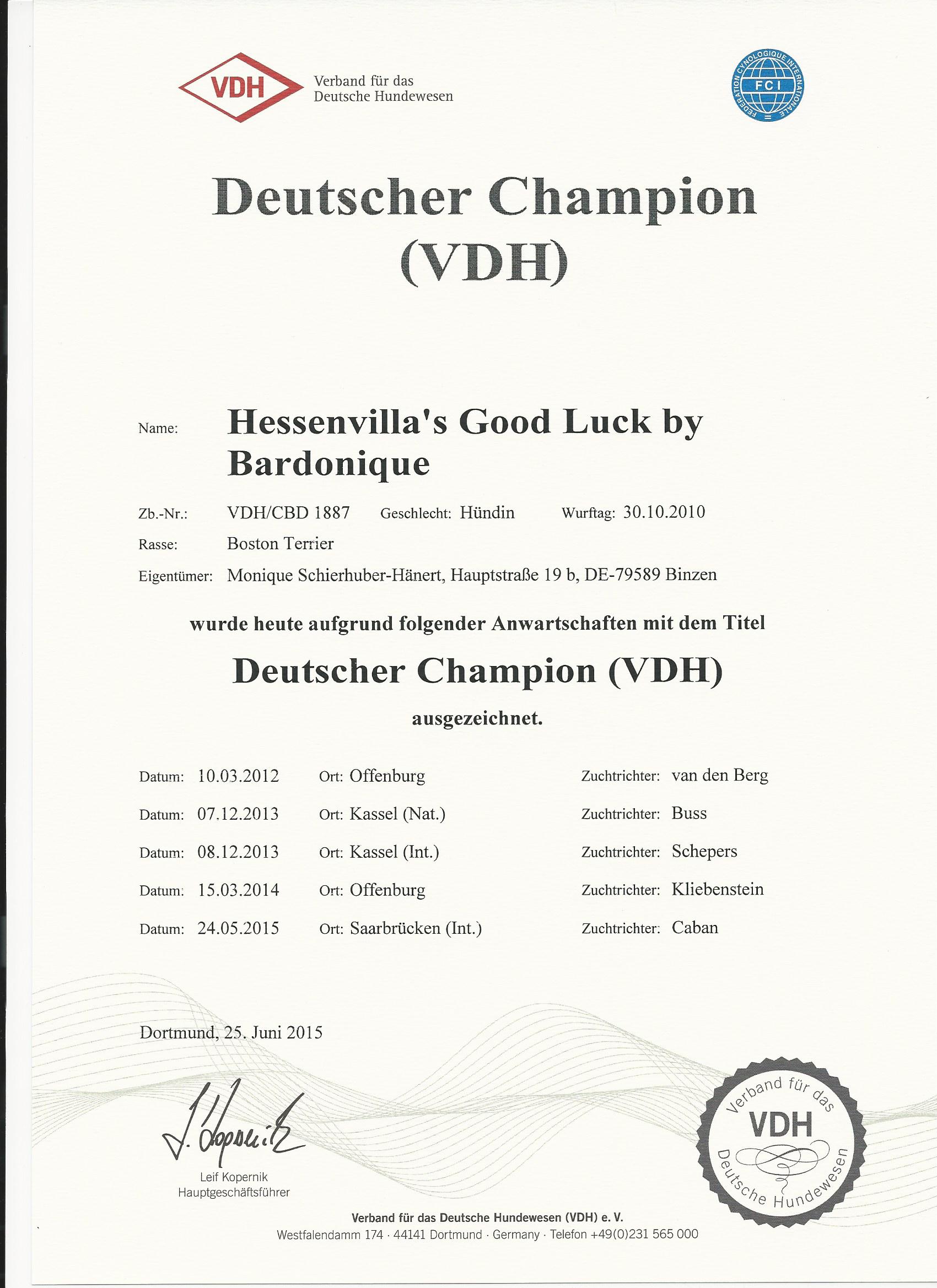 Hurra, seit heute ist es offiziell! Emelie (Hessenvilla's Good Luck at Bardonique) hat heute Ihre Urkunde erhalten. Sie ist nun offiziell Deutscher Champion VDH. Wir sind sehr stolz!